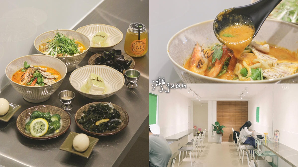 台中人氣泰式滷味「太泰滷味」的老闆新品牌「灣guán濃湯麵」,隱藏在勤美商圈巷內,每季更換濃湯麵品項,每次來都是期間限定!結合台灣在地特色元素,創造出一道道美味、濃而不膩的濃湯麵! 隱身在華美街巷內,一不小心就會錯過了!門口寫著大大的灣字就是了! 文青簡約綠白裝潢,店內氛圍給人清新愜意感~加上金屬…