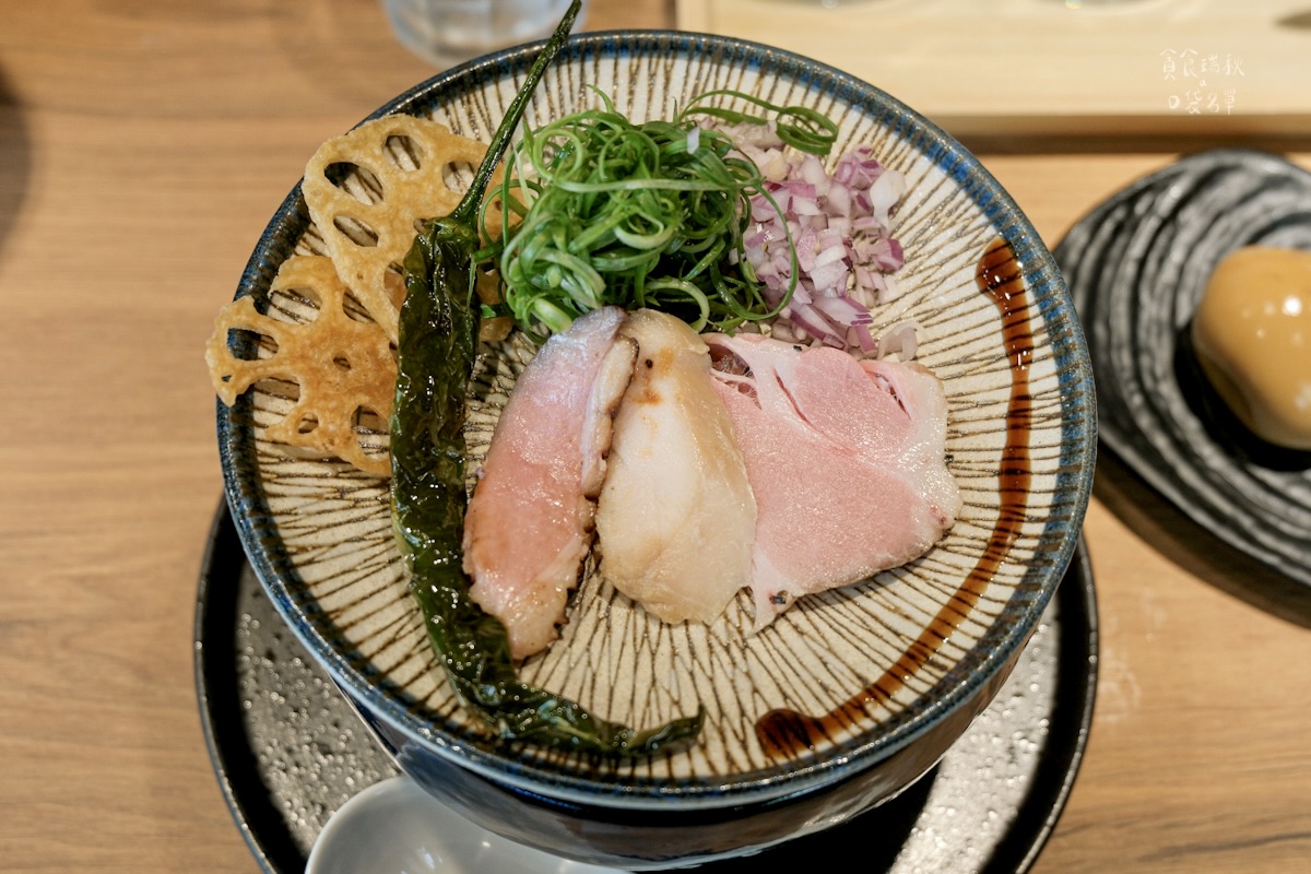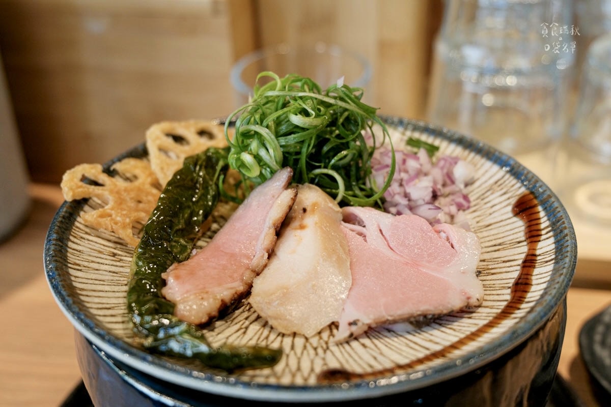 盤子上是雞豬鴨三種叉燒、兩片炸蓮藕、一條炙燒過的糯米椒,叉燒我最愛鴨肉的口感,尤其炙燒過~鴨肉香氣滿滿!炸蓮藕很脆口,可以稍微泡一下熱湯,吸附一點湯汁更美味!原本以為糯米椒是裝飾用,但炙燒過的口感意外不錯~一旁有一點醬汁可蘸著吃,後來問店家說是他們自己自製的醋醬,酸甜味還不錯