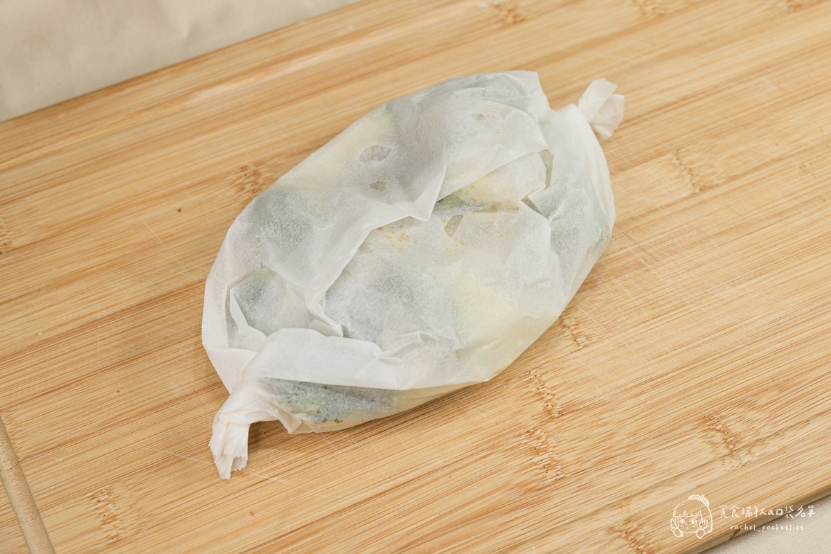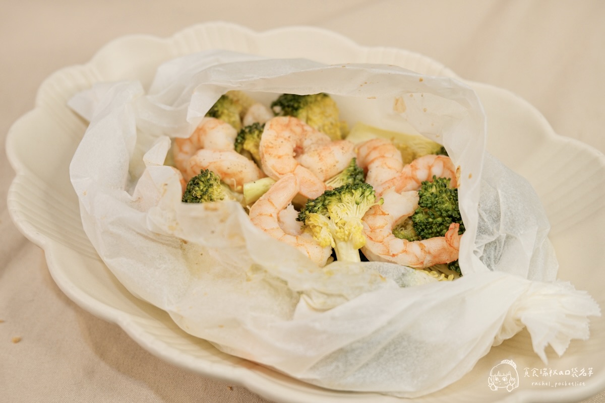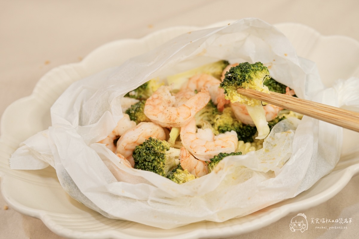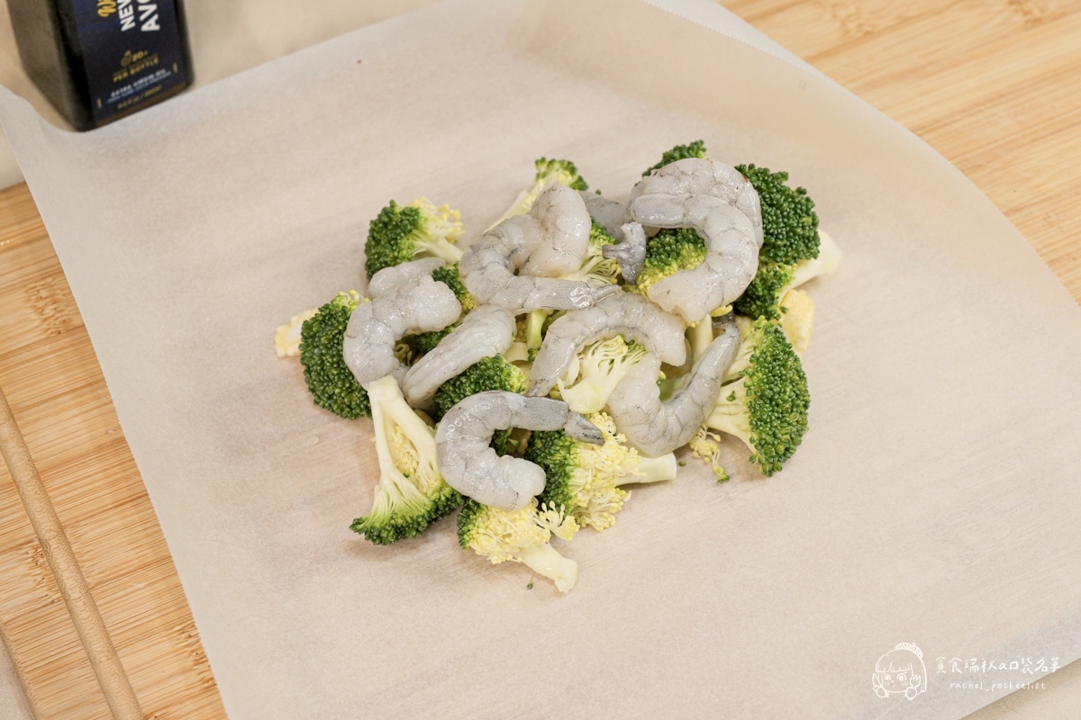 只需簡單鋪好蝦仁與蔬菜,用烘焙紙包起來放進烤箱,180度15分鐘就能享受蒜香四溢的健康海味料理!遠紅外線讓蔬菜熟得剛好不乾硬、蝦肉Q彈不乾