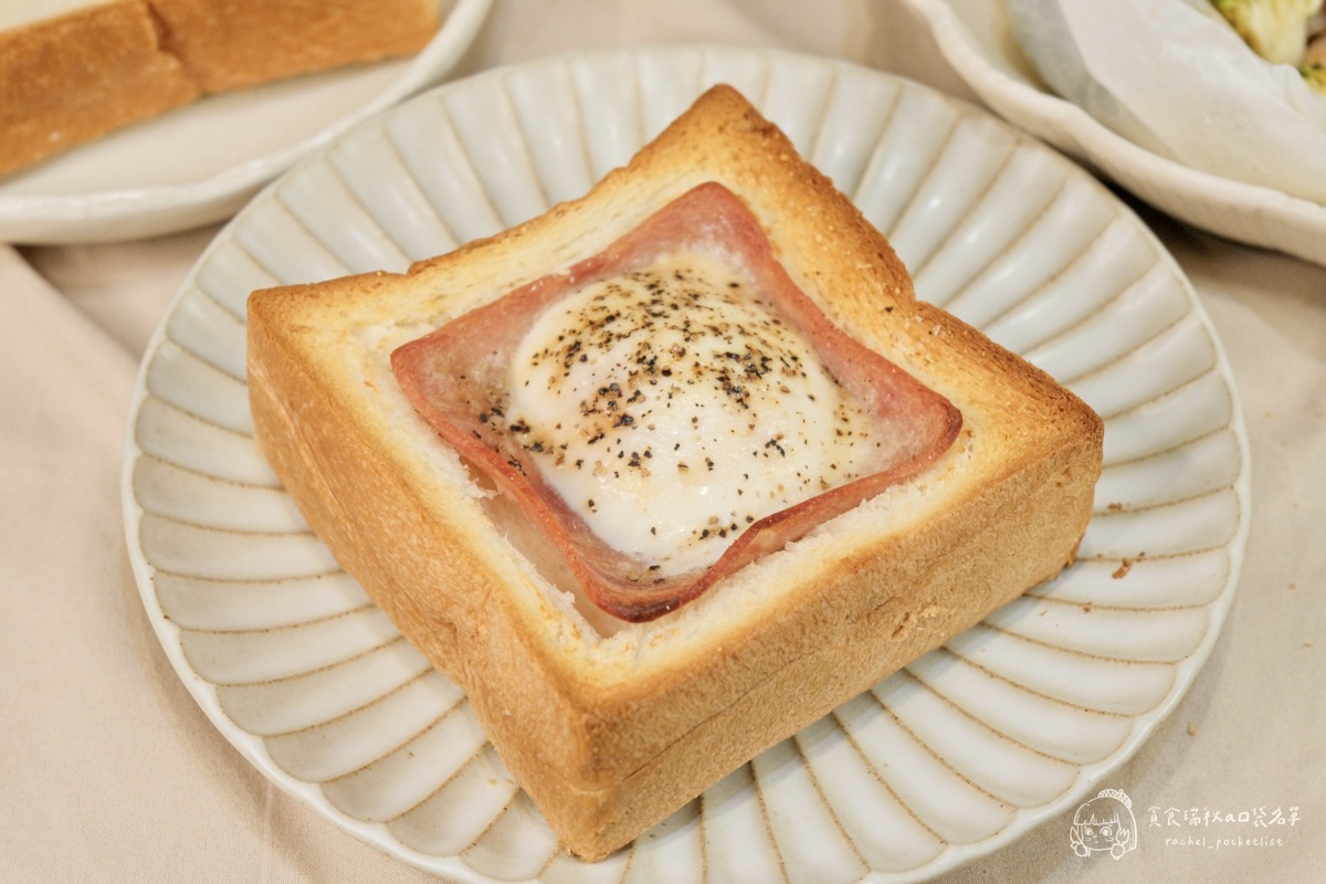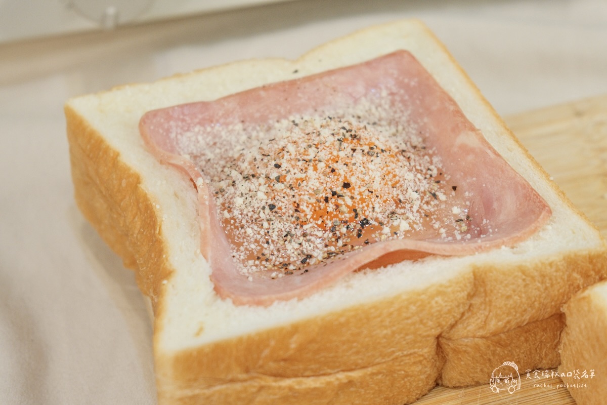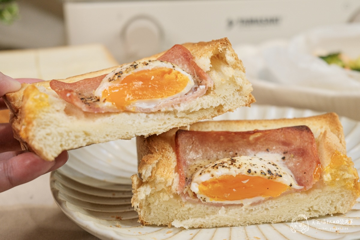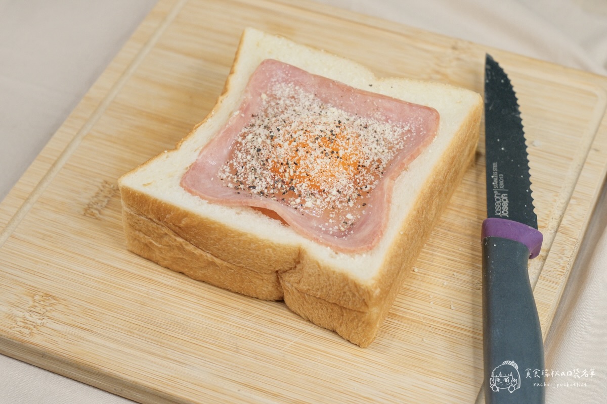 早晨經典!先在厚片上挖個方型,鋪上火腿與雞蛋,再灑上起司粉與黑胡椒調味,設定200度烤約15分鐘即可。外酥內軟、香氣撲鼻,蒸氣讓吐司邊緣不乾硬!